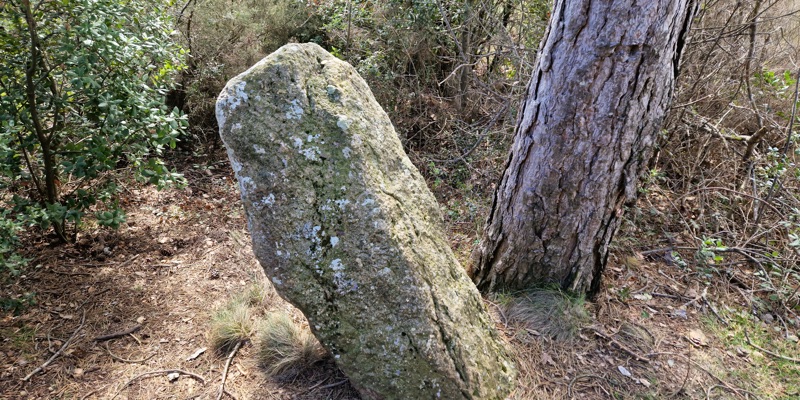 En regardant attentivement sur le côté gauche, en lisière de la première prairie proche du sommet, nous apercevons la « Pierre Droite » : petit menhir d'une hauteur d'environ 1m50, au pied d'un pin.