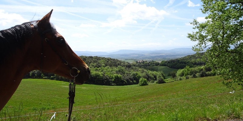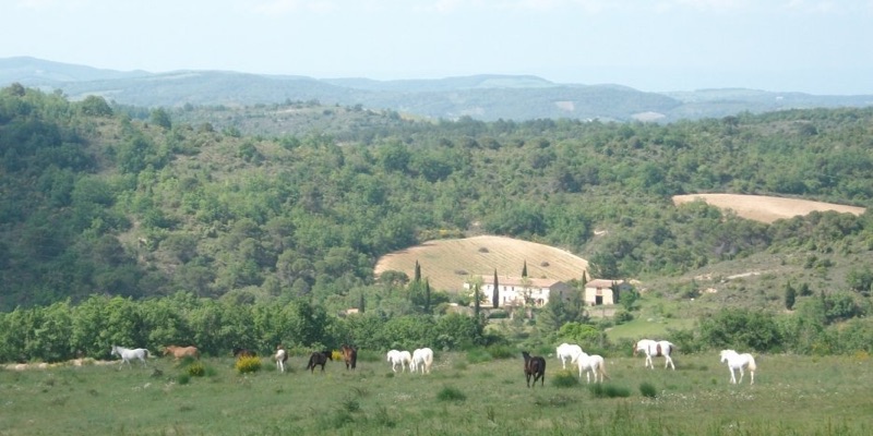 Nous sortons de Limoux et remontons par un chemin de terre à travers les vignes puis par un joli bois de chênes verts et de feuillus vers le domaine de Ninaute, où nous longeons les paddocks du centre équestre municipal. Nous continuons ensuite vers la crête et les domaines de Laux et Perry.