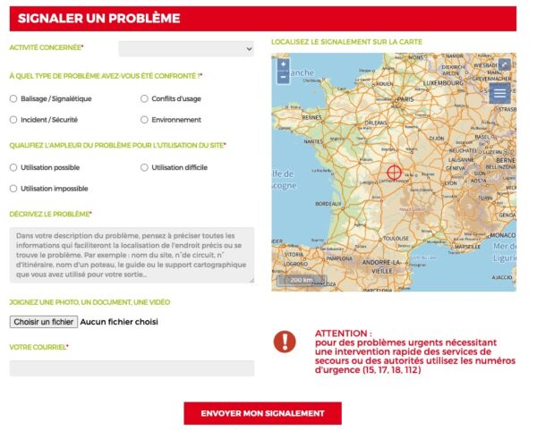L'utilisateur pratique son activité sous sa propre responsabilité et sera seul responsable envers les tiers en cas d'accidents, dégâts ou dommages de toute nature survenus durant l'activité. Vérifiez aussi la praticabilité des itinéraires auprès des gestionnaires locaux (communes, conseils départementaux....) Le propriétaire ou gestionnaire est chargé de l'entretien des chemins et tout manquement à cette obligation relève de sa responsabilité.